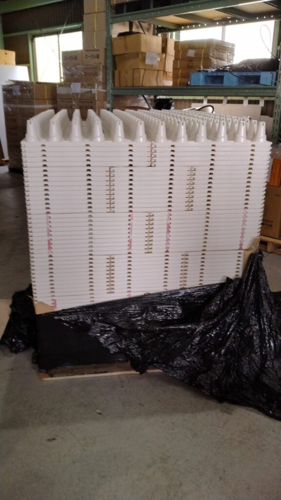 カタツムリポット10枚で約20cmの高さになります。基本10枚で束ねられており、一段における枚数は商品によって異なります。(写真は一段80枚)