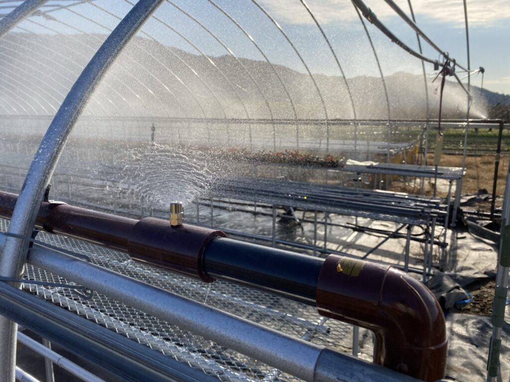 果樹に必要な水分を均等に供給して果実の成長を促進するとともに、特に乾燥した時期や雨が少ない地域で役立ち、さらに開花期の夜間や早朝に霜が降りるのを防ぐために水を散布して枝や果実表面の温度を保つ(氷結熱を利用した方法)霜害対策としても使用されます。